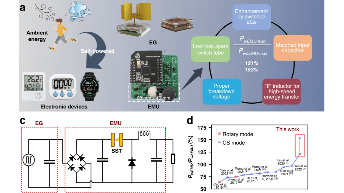 That will not be the case sooner or later, nonetheless, due to the efforts of a analysis workforce at Tsinghua College. They’ve developed an power administration unit (EMU) that considerably enhances the effectivity of electrostatic mills when powering electronics like IoT gadgets. When paired with one particular kind of electrostatic generator, a rotary electret generator, 1.2 instances higher energy output was achieved. Assessments with a triboelectric nanogenerator had been much more spectacular, with energy output being elevated by 1.5 instances.