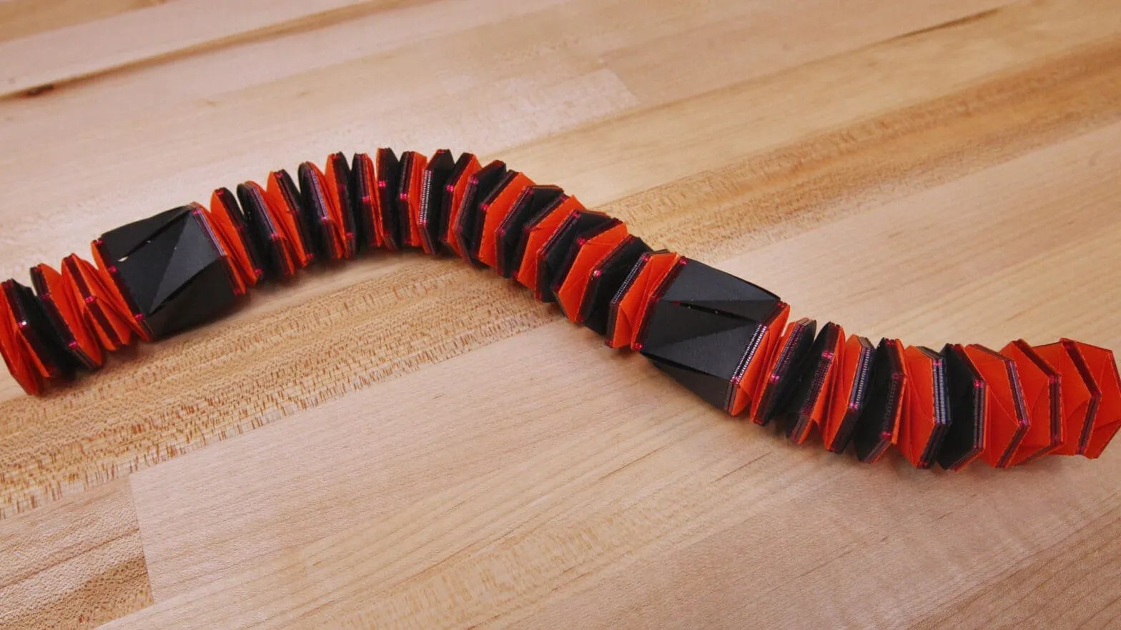 The robotic is shaped from cylindrical segments, every of which is folded right into a Kresling sample. This sample is a typical origami fold that causes a cylinder to snap right into a flat disk-like form when pressure is utilized to it within the correct approach. This bistable nature of the folds, which makes them are inclined to wish to be in a single state or the opposite, was leveraged by the management system.